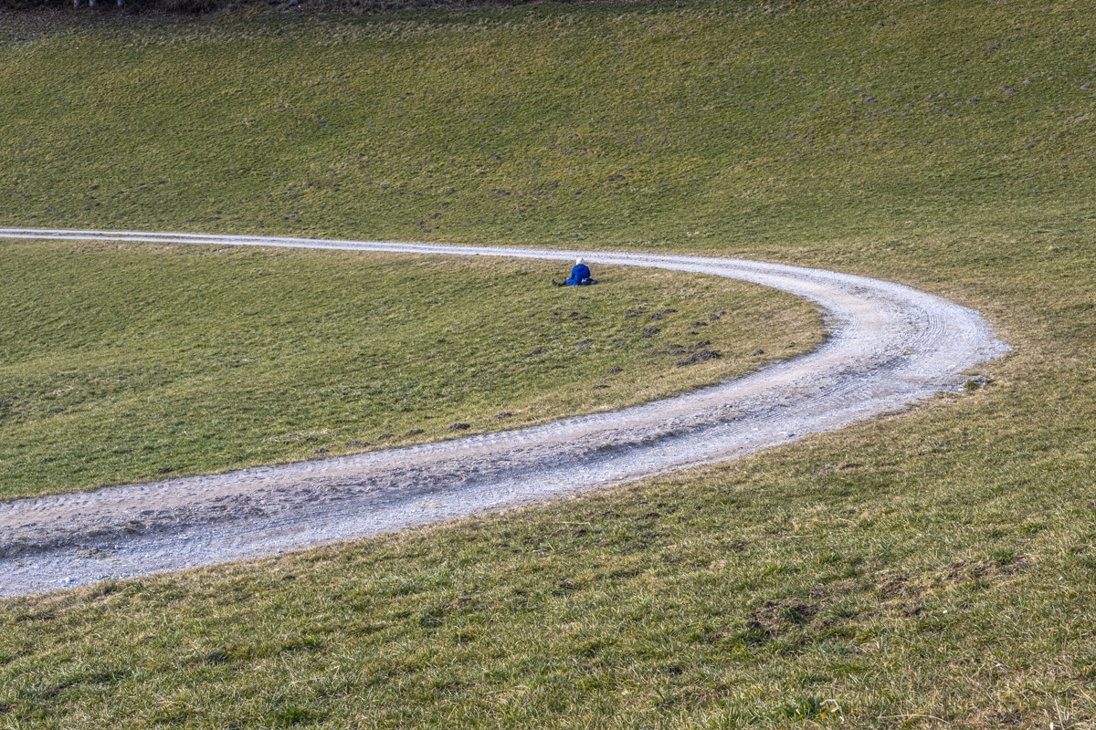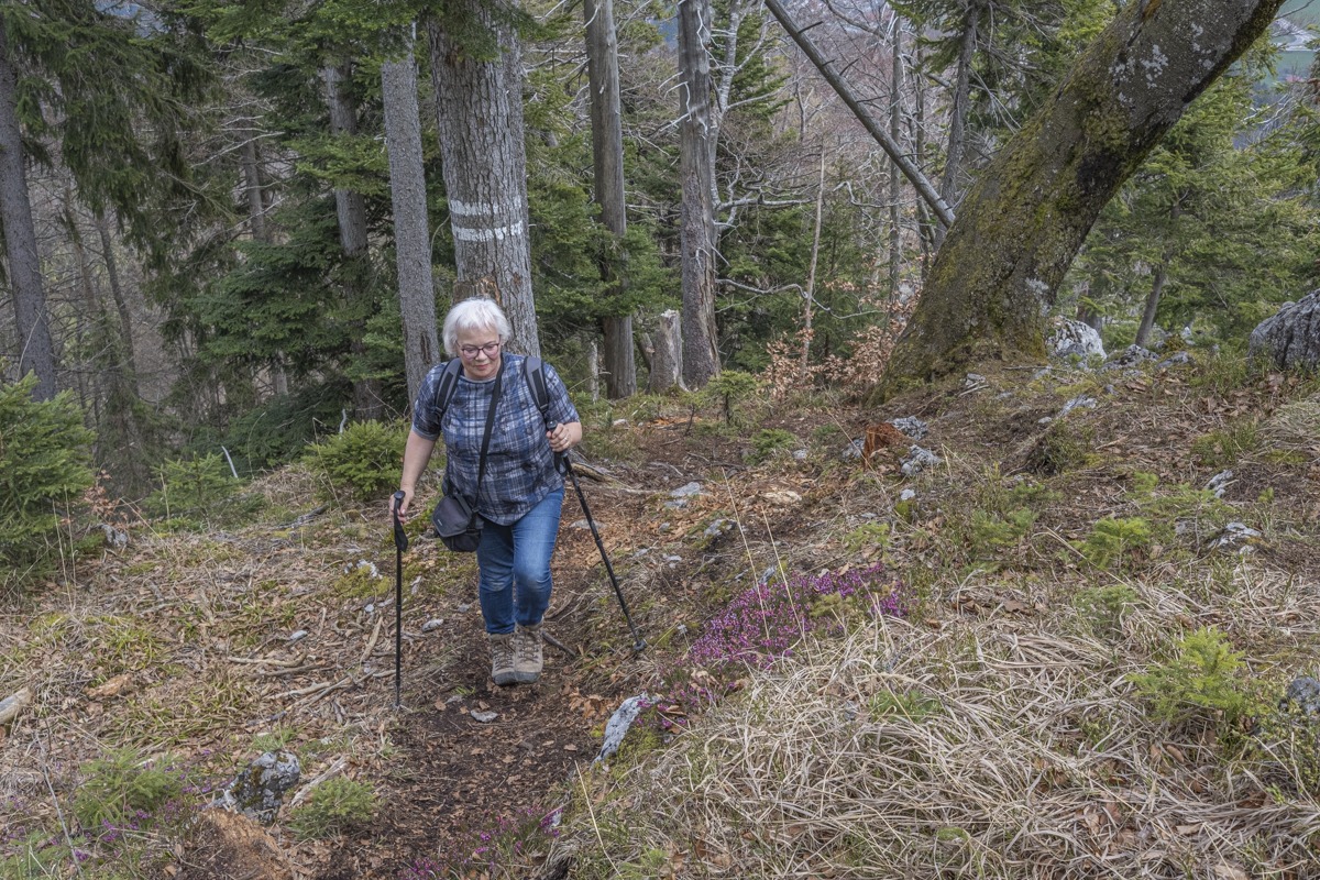 Der Abstieg muss leider sein, also direkt nach Süden hinunter, und dann auf Straße und Steig im Wechsel bis zur Hauptstraße. Auf Asphalt nun länglich zurück zum Parkplatz. Mit Gudrun.