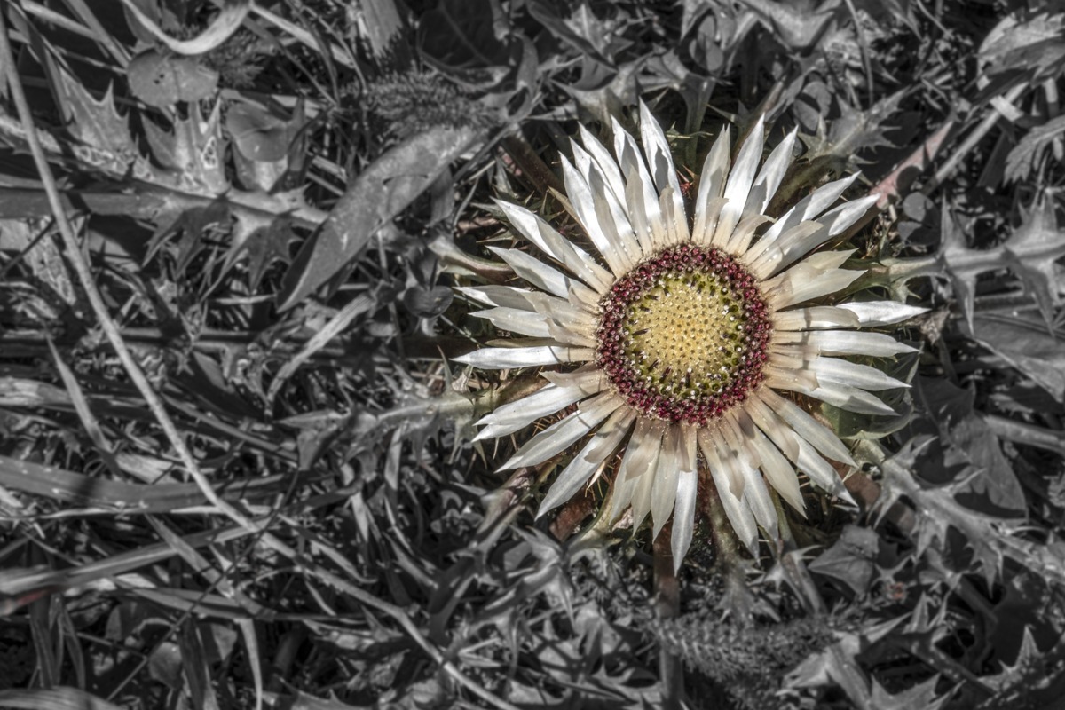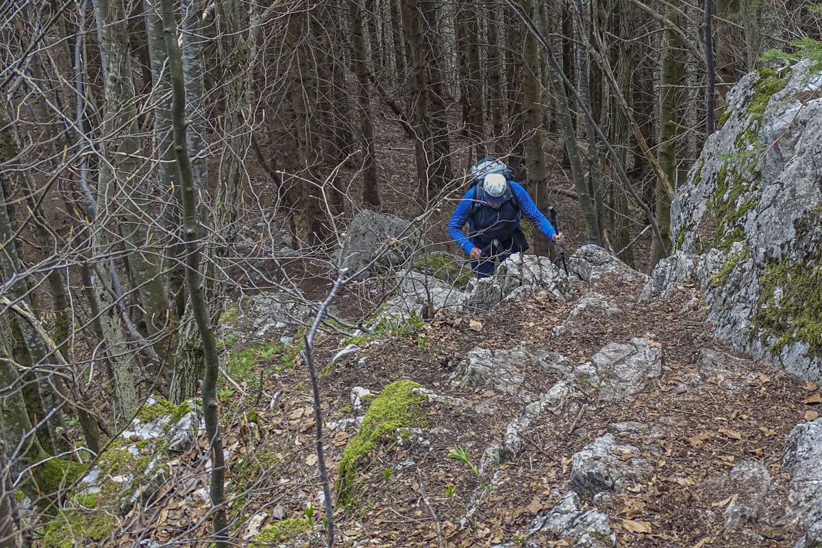 Es ist bewölkt, eine kleine Runde wäre angesagt. Ich studiere die Karte und sehe die Wege 230 und 231 östlich von San Vito. Wir finden 230 nicht nur auf der Karte, gehen so dahin, und gelangen zu einem breiten sich bereits wieder begrünenden Schuttfeld. Steinmänner weisen nach oben, steil, eigentlich sollte es etwas Kleines werden, bis die Männer sich teilen. Einige weisen nach oben, andere nach unten. Wir gehen nach unten, steil, Überraschung, es ist 231, und schließlich gibt es auch noch einen Steig zurück oberhalb der Straße. Keine spektakuläre Runde, die Berge sind in Wolken, irgendwie doch entspannend.