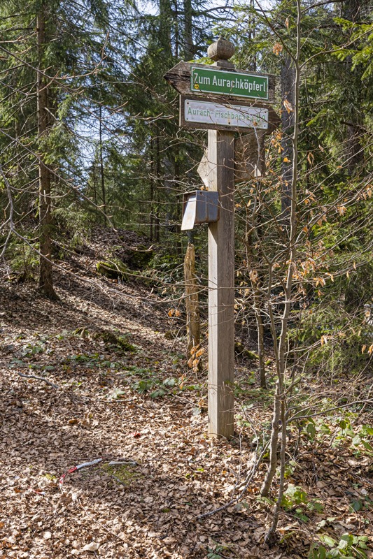 Eine Nachmittagstour. Der Berg wird mittels einer Acht bezwungen, also die Wegführung gleicht einer Acht, der Mittelpunkt ist das Pletzereck. Geparkt wird am Bahnübergang der Fischeralmstraße. Vom Pletzereck hinauf über den Südostgrat, hinunter nach Norden. Das Auracher Köpferl ist eine aussichts- und gipfelkreuzlose Tour. Aber es gibt viel gefährlich frische Luft, deshalb ist Skifahren ja auch verboten worden. Mit Gudrun.