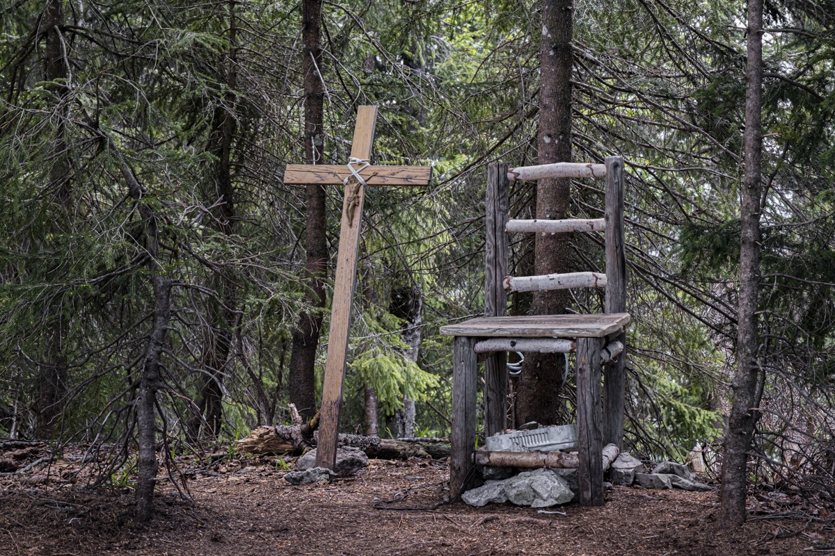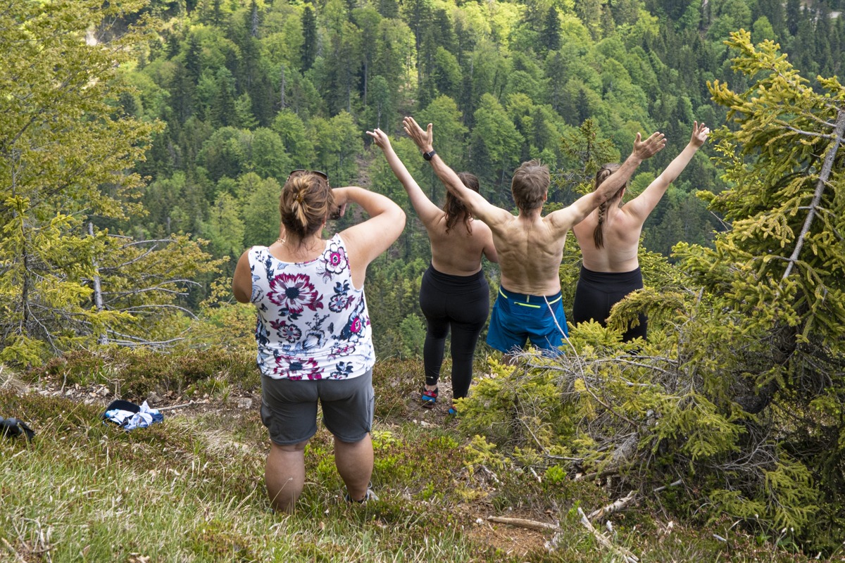 Dort, wo der Kleine Wappbach in den Weitsee mündet, ist ein Parkplatz. An dem idyllischen Bach entlang und hinauf zur privaten Gräbenalm. Weiter Richtung Südwesten bis in einen kleinen Sattel. Nach links zweigt ein Weg ab durch einen alten Windbruch und führt hinauf zu einem Stuhl mit Gipfelkreuz inmitten von Bäumen. Die Aussicht offenbart sich aber erst einige Meter weiter unten. Ein atemberaubender Tiefblick auf den Weitsee. Schön. Und wir werden Zeugen des nur alle 10 Jahre stattfindenden Stuhlkopf-Rituals ;-). Zurück in den Sattel und nach links bis zu einer kleinen Straße kurz vor der Pöschalm. Auf den Sträßchen nach links und hinunter zur Bundesstraße und zum Parkplatz. Problemlose Wegfindung im Gegensatz zur Beschreibung und viel Betrieb. Baden im Weitsee ist obligatorich, zumindest für Gudrun. Mit Gudrun.