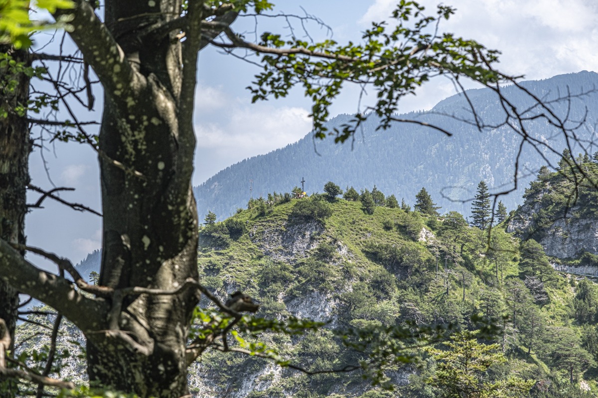 Eine Wiederholungstat. Vor zwei Jahren im März waren wir bereits da, es lag noch Schnee. Heute ist es heiß. Vom leeren Parkplatz des Badhauses (Betriebsurlaub) geht es hinauf zur Lengau Kapelle und weiter nach Lengau, einem idyllisch gelegenen Bauernhof mit dem Pölven im Rücken. Die Forststraße lässt sich abkürzen, keine elektrischen Biker mehr. Das Gipfelkreuz auf dem Juffinger Jöchl ist eingehegt von Laubbäumen, die Sicht ist dementsprechend.