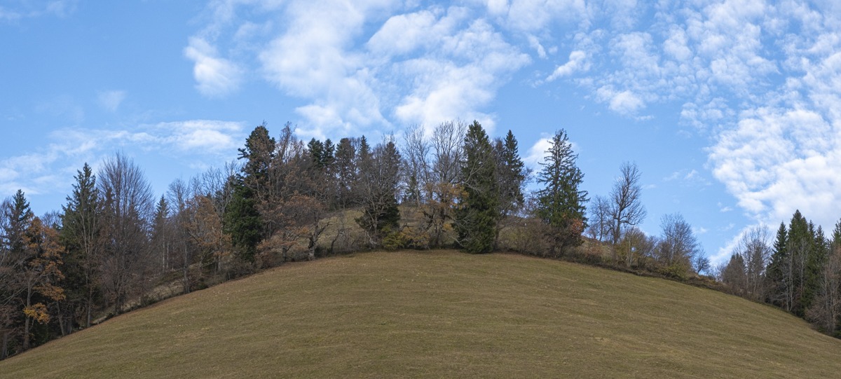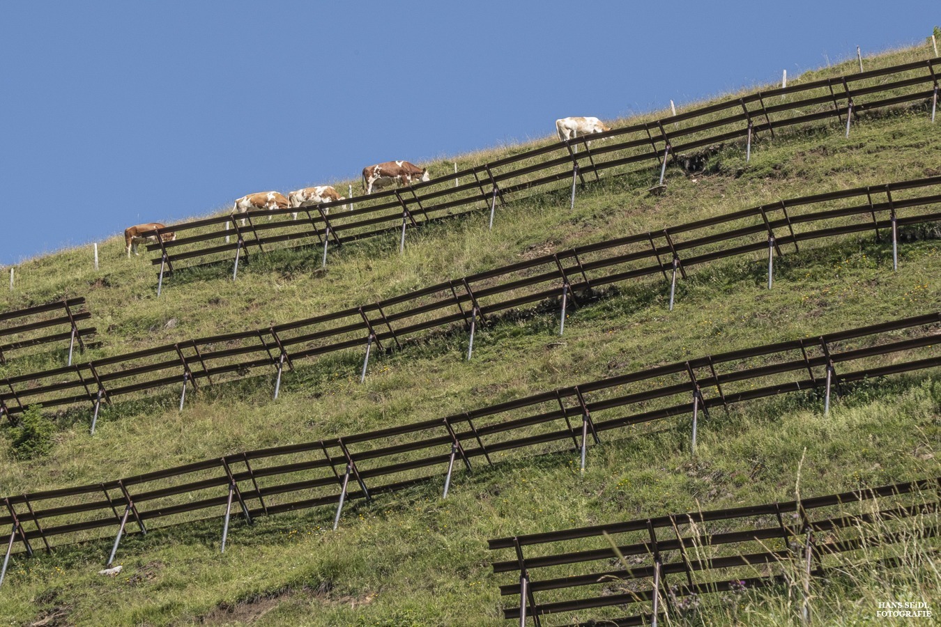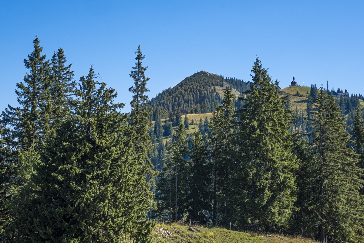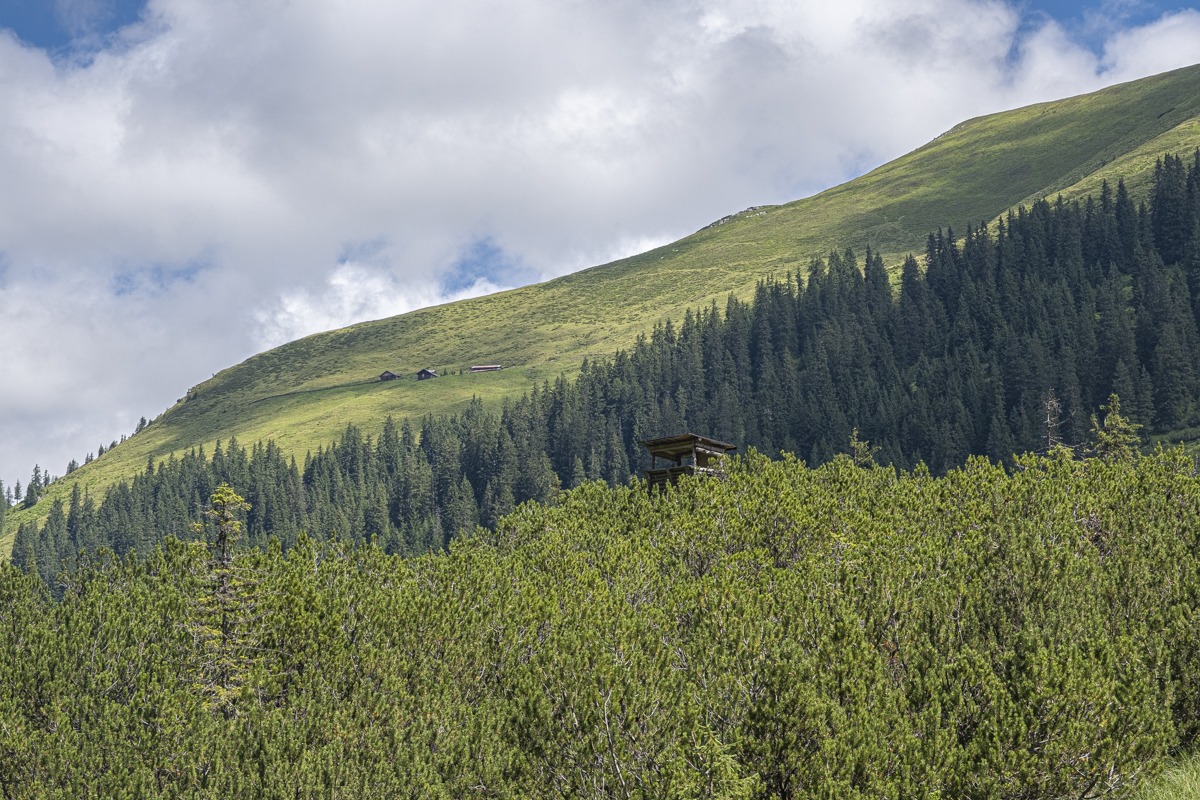 Die aktuell hohen Temperaturen lassen den Verzicht auf Gipfel als angemessen erscheinen. Lieber unten bleiben. Also genügt eine Almen-Runde im hinteren Jenbachtal. Vom Parkplatz zur Hillstoaner Alm und dann weiter Richtung Schloßalm. Aber zuerst gehe ich weglos über die Weidewiesen auf die kaum ausgeprägte Kuppe des Roßstallkopf. Mit Blick auf die Aiblinger Radome. An der Schloßalm vorbei auf die Almstraße, die sich zum Glück etwas abkürzen lässt. Da nicht unmittelbar am Wegesrand liegend, wird die Wirtsalm ignoriert, und ich gehe auf der Straße zurück zum Parkplatz.