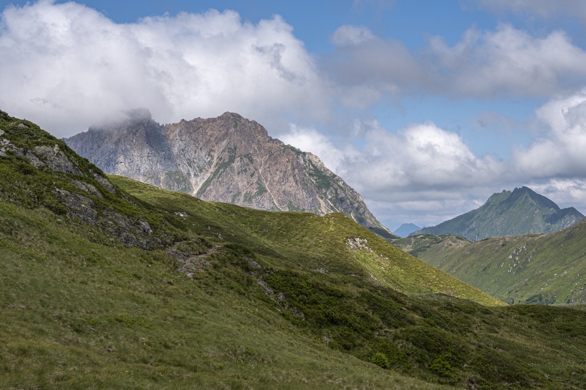 Für die Croda Negra 2518m starten wir vom Passo Falzarego. Ein Felsrücken mit steil und senkrecht abfallenden Flanken. Ein schmaler Felsspalt vermittelt den Durchstieg auf den Rücken. Heute lässt sich auch die umgebende Landschaft genießen, hohe Berge, grüne Wiesen mit vielen Blumen und Cumulus-Wolken, die mit der Größe der Berge mithalten wollen. Am Lago Limores wird noch einmal gerastet.