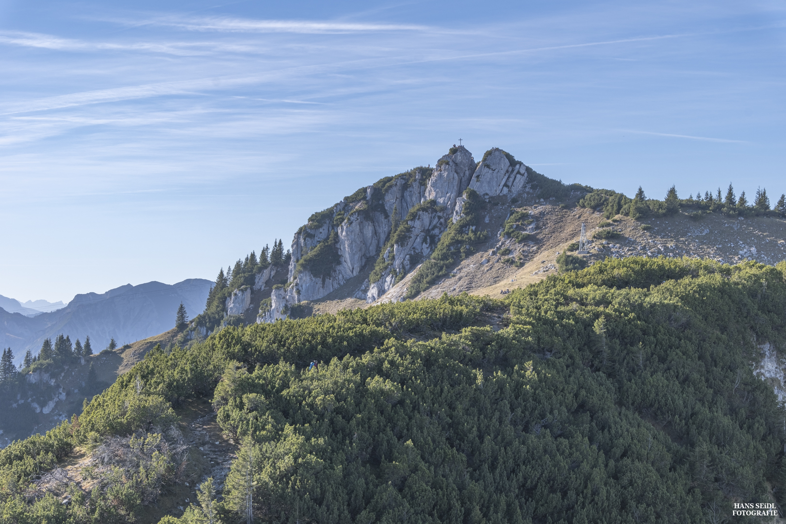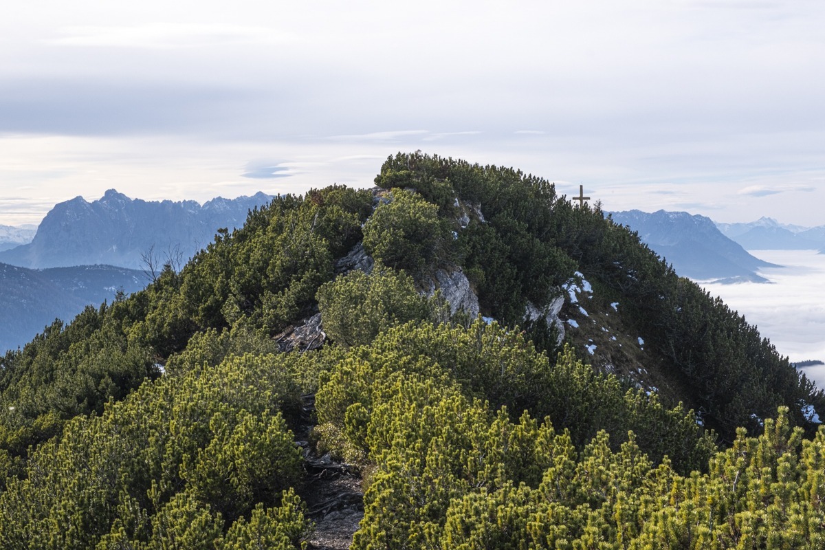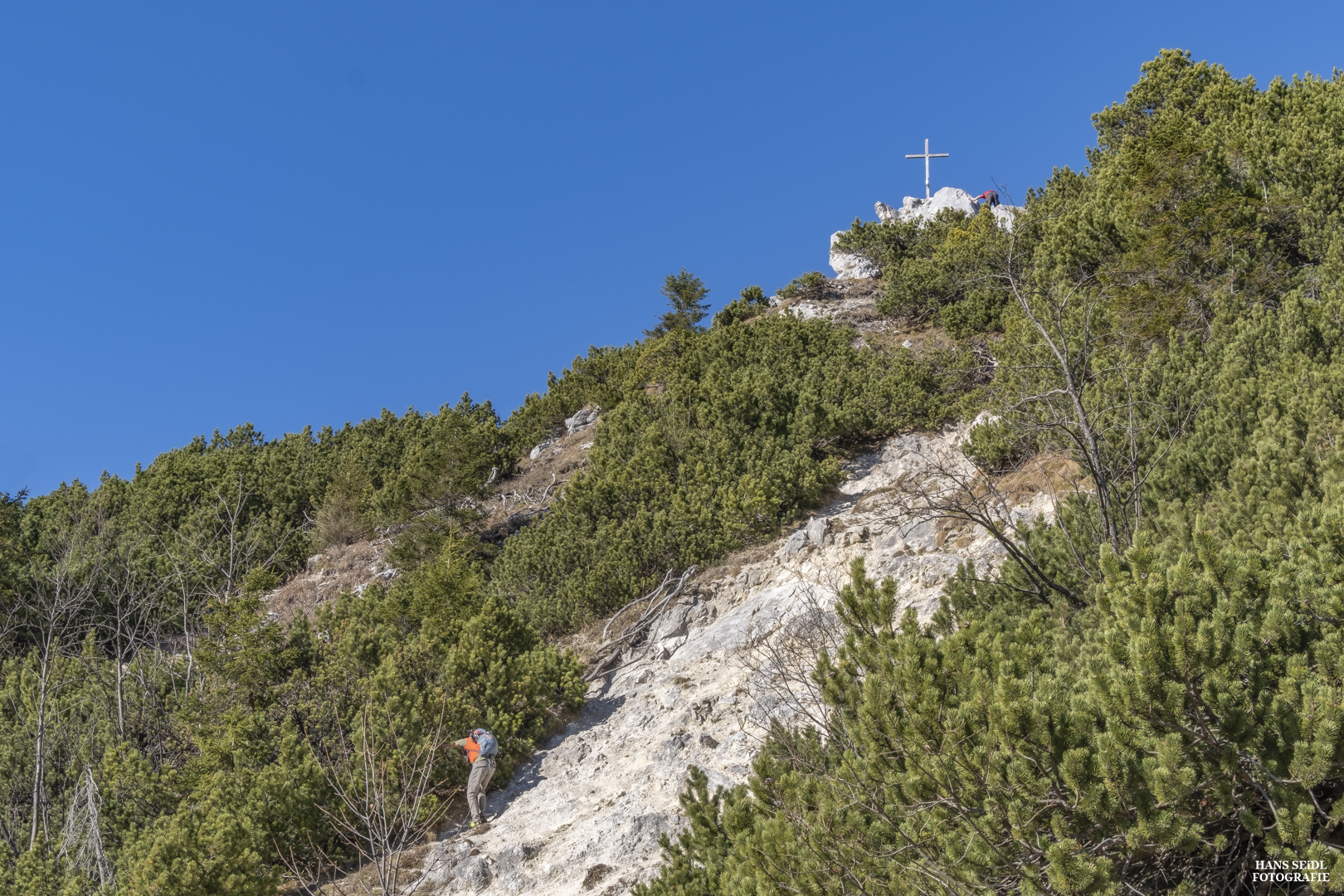 Wieder ist es ein Tag mit strahlend blauem Himmel in den Bergen und grauer Düsternis im Alpenvorland. Wir starten von dem Großparkplatz gegenüber dem Unteren Sudelfeld. Der Aufstieg ist klar vorgegeben: ein nicht zu verfehlender Weg an den Lacheralmen vorbei und hinreichend viele Wanderinnen und Wanderer. Später, hinter einer Hütte, teilt sich der Steig. Wir nehmen den rechten (und steigen über den anderen ab), erreichen den Querweg zwischen Wildalpjoch und Lacherspitze, gehen kurz nach links und stehen vor einer Art Flanke aus Sand/Schotter/Fels, begrenzt von Latschen, die zum Gipfel des Seewandköpfl hinaufzieht. Die Erinnerung an die vergangenen goldenen Zeiten wird aktiviert – damit gelingen die wenigen rutschigen Höhenmeter zum Gipfelkreuz. Viel Platz ist hier oben nicht. Hinunter ebenfalls im Gedenken an vergangenes Erreichtes (hilft aber nicht viel) und mit Sonnenpausen zurück. Mit Gudrun.