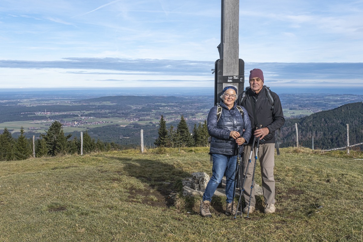 Im Juni 2019 war ich das erste Mal auf dem Erlbergkopf, ohne anschließende Dokumentation auf meiner Website. Jetzt ist es anders. Der Ausgangspunkt ist derselbe wie bei der Wanderung auf den Reifenstein am 17.12.2023. Wir gehen zur Schmiedalm und dann über die Wiese hinauf zum Gipfelkreuz. Ein nettes Plätzchen. Nach Norden hinunter und noch einmal hinauf zum aussichtslosen Schwarzenberg. Die Vockalm wird links liegen gelassen, und auf der Straße hinunter und hinaus an Aigen vorbei zum Wanderparkplatz. Mit Gudrun.