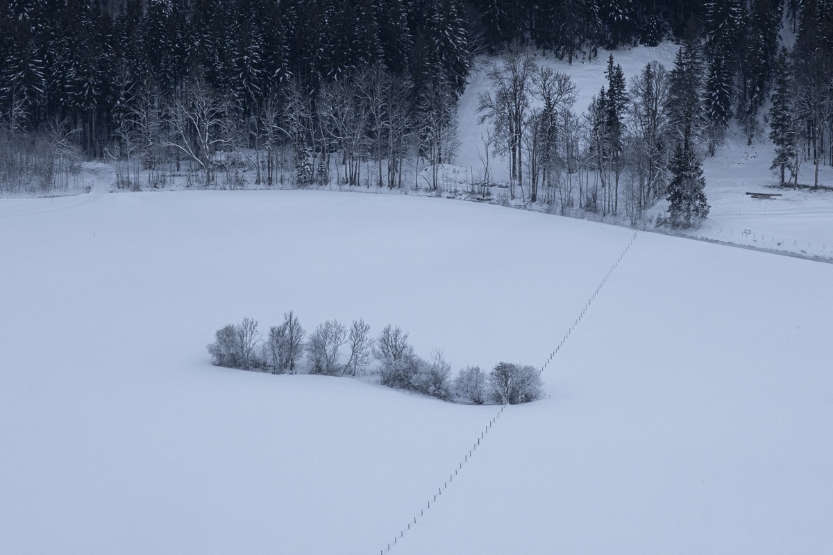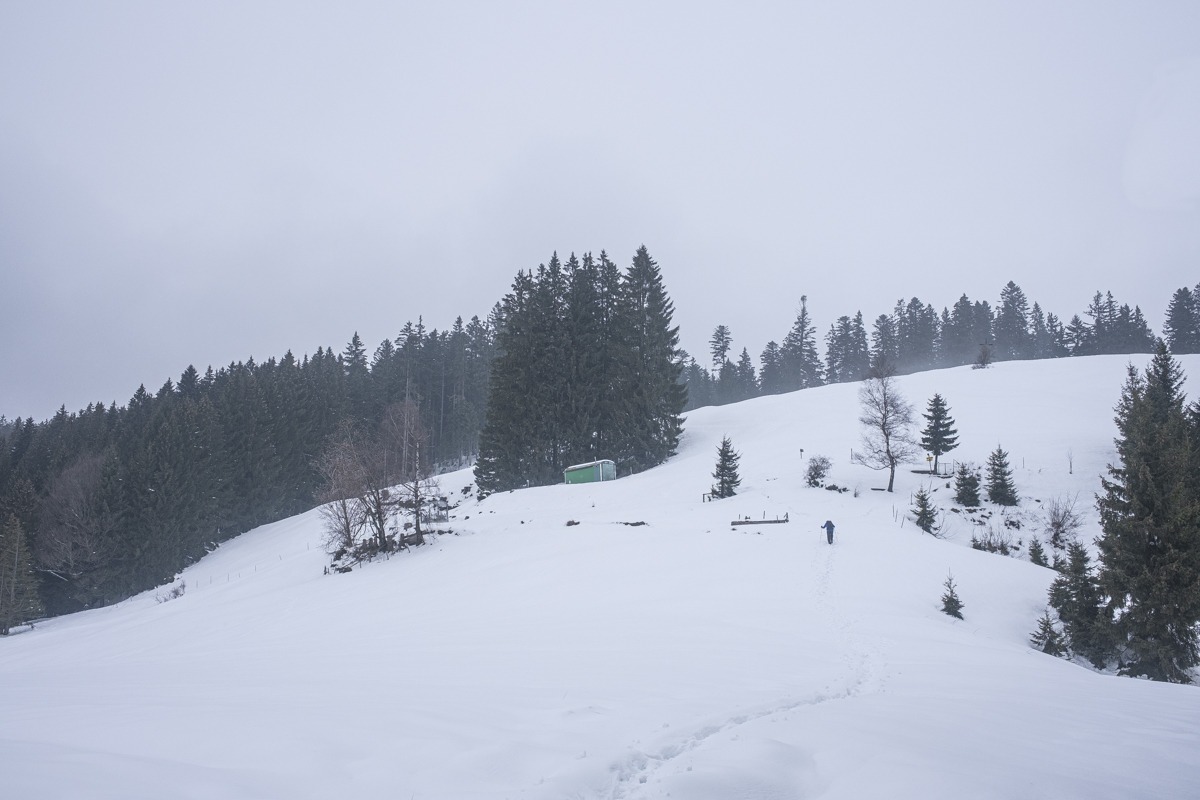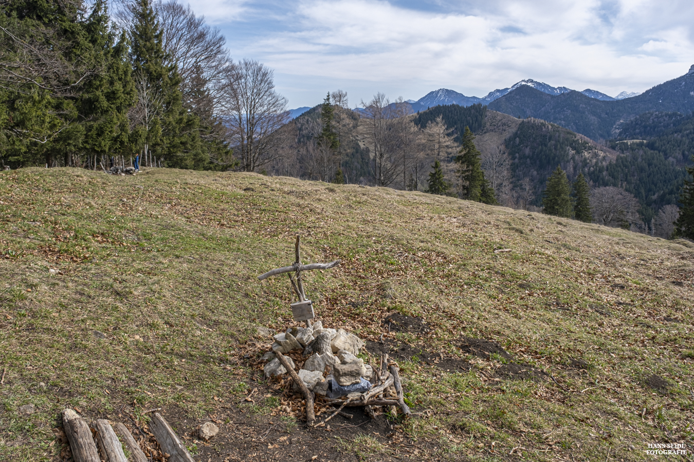 Wasenkogel heißt das (Gipfel)Kreuz direkt oberhalb der Holzer Alm. Aber die Holzer Alm ist schon lange nicht mehr unter uns, ein grüner Bauwagen ist an ihre Stelle getreten. Dadurch und mit der überbreiten Forststraße hat die Wanderung zu der Wiese mit der kleinen Aussicht auf den Tegernsee ihren Reiz verloren. Im Winter bietet die weiße Schneedecke zumindest einen neuen Blickwinkel. Die Stille und der Nebel verfremden den Ort. Mit Peter.