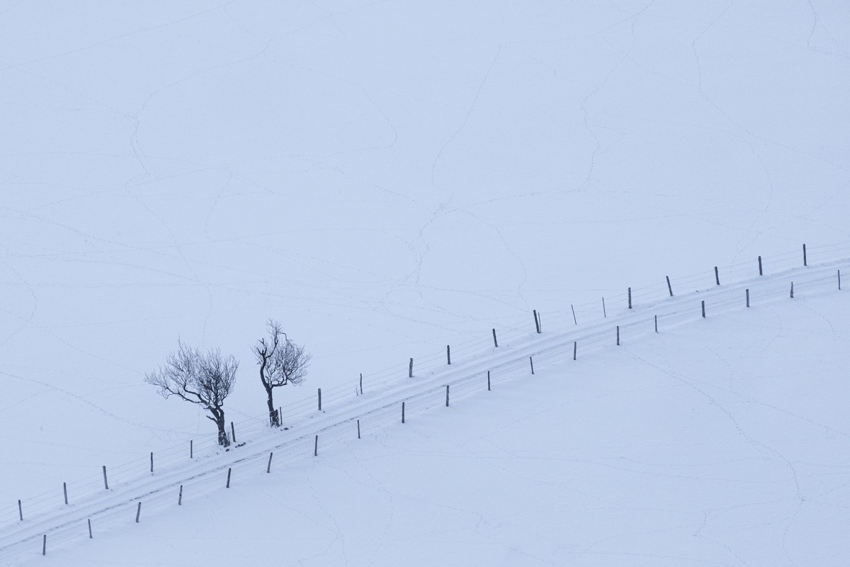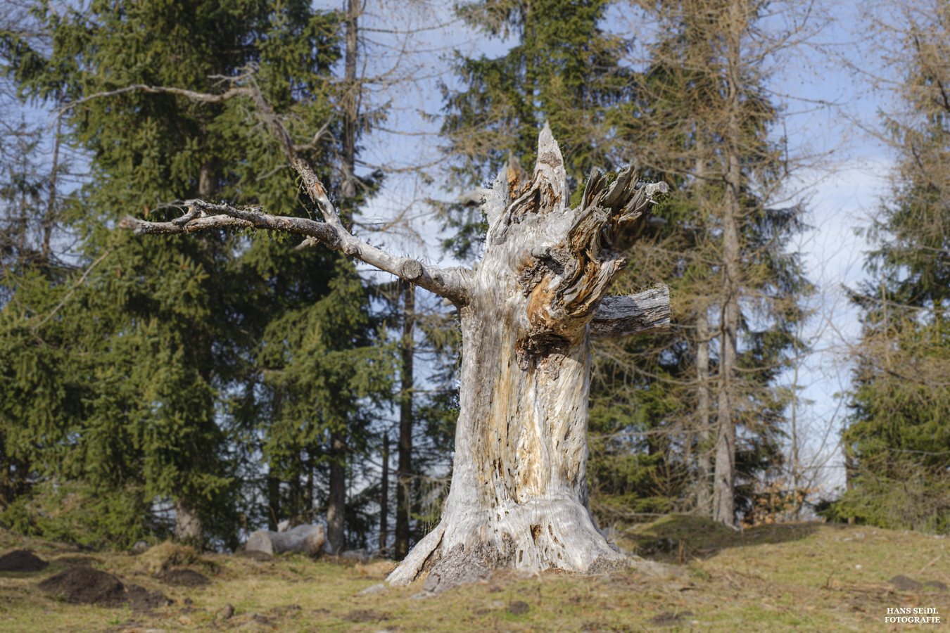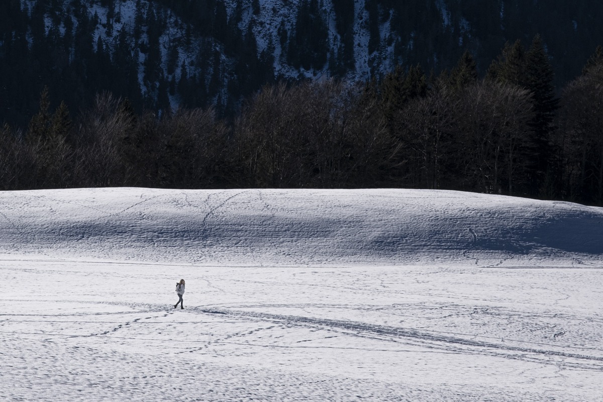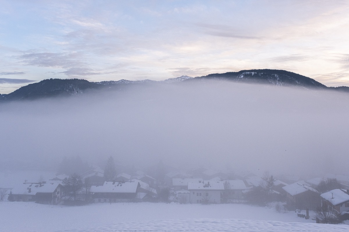 Wasenkogel heißt das (Gipfel)Kreuz direkt oberhalb der Holzer Alm. Aber die Holzer Alm ist schon lange nicht mehr unter uns, ein grüner Bauwagen ist an ihre Stelle getreten. Dadurch und mit der überbreiten Forststraße hat die Wanderung zu der Wiese mit der kleinen Aussicht auf den Tegernsee ihren Reiz verloren. Im Winter bietet die weiße Schneedecke zumindest einen neuen Blickwinkel. Die Stille und der Nebel verfremden den Ort. Mit Peter.