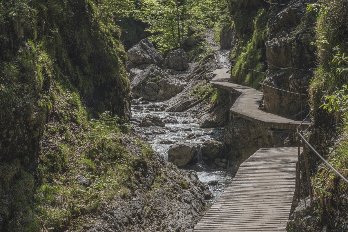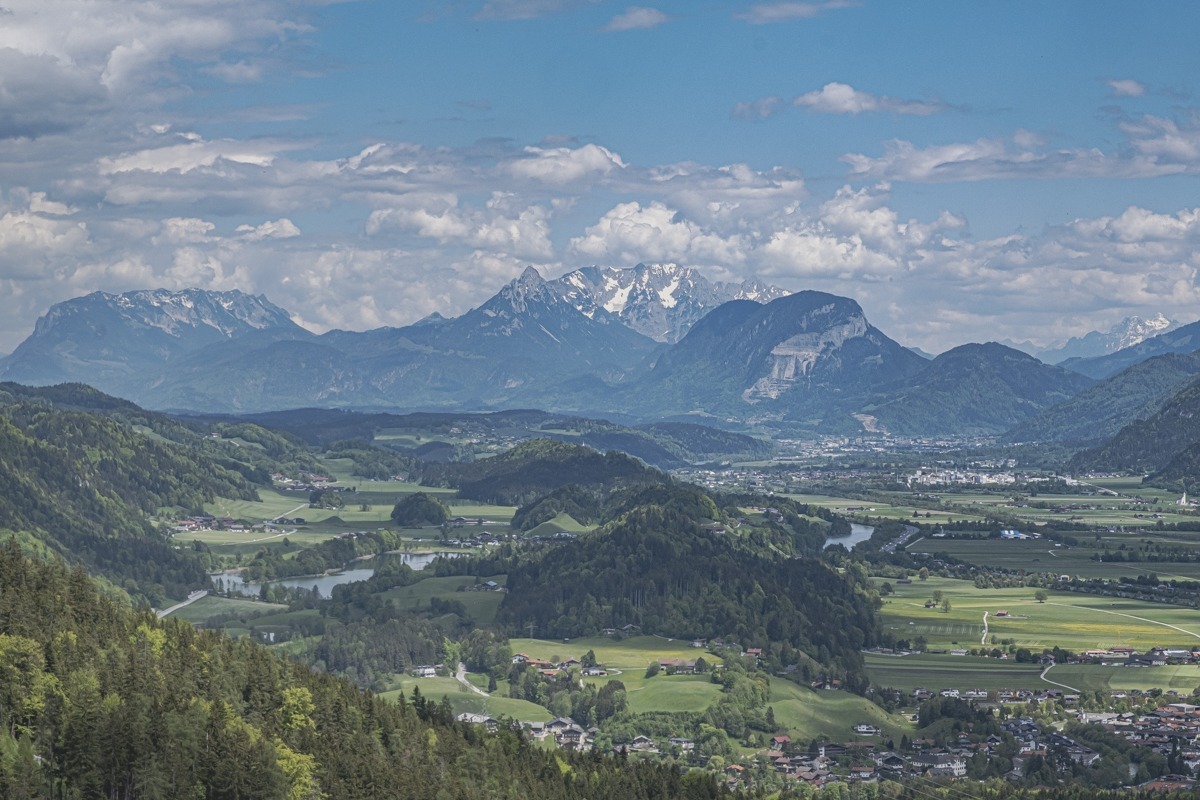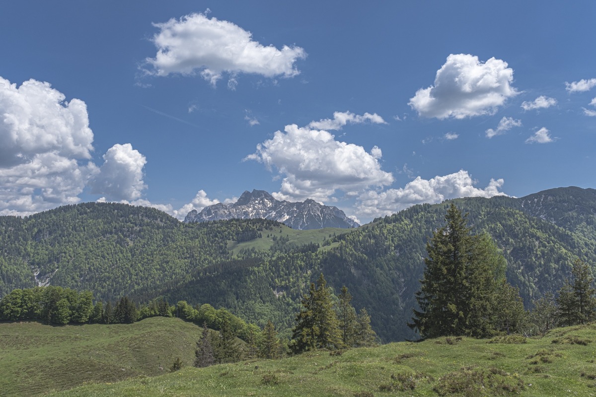 Eine kühle Klamm für einen heißen Tag und anschließend die vorgeschlagene Almenrunde. So ist der Plan. Von dem ausgewiesenen Parkplatz bei Erpfendorf führt ein touristischer Weg (links und rechts ein Zaun) zum Beginn der Klamm, die eher eine breite Schlucht ist. Highlights sind die beiden Hängebrücken und die Bretterwege. Das Ganze mündet in eine sehr breite Forststraße. Nach ca. 1km zeigt rechts der Jägersteig ab. Oberhalb der Angerlalm ist ein kleiner grüner Gupf mit Kreuz. Ich entscheide mich gegen die bewirtschaftete Alm und werde dafür oben mit einer Super-Aussicht belohnt – Kaiser, Unterberghorn, Fellhorn, Steinplatte, Loferer Steinberge. Abgestiegen wird zu einem Teich und weiter zur Huberalm. Geschlossen, so war nicht der Plan. Links unterhalb beginnt dankenswerterweise – ich hatte mit einem Straßenabstieg gerechnet – ein Steig, der bei den Häusern von Erpfendorf endet.