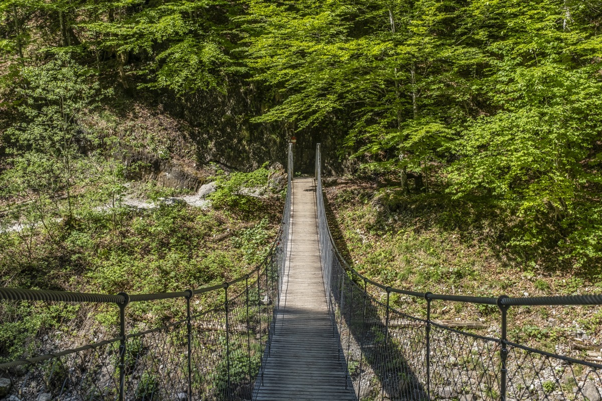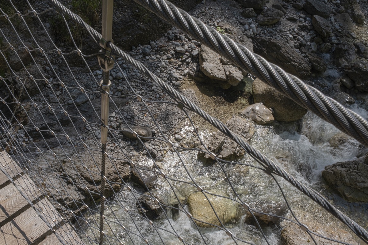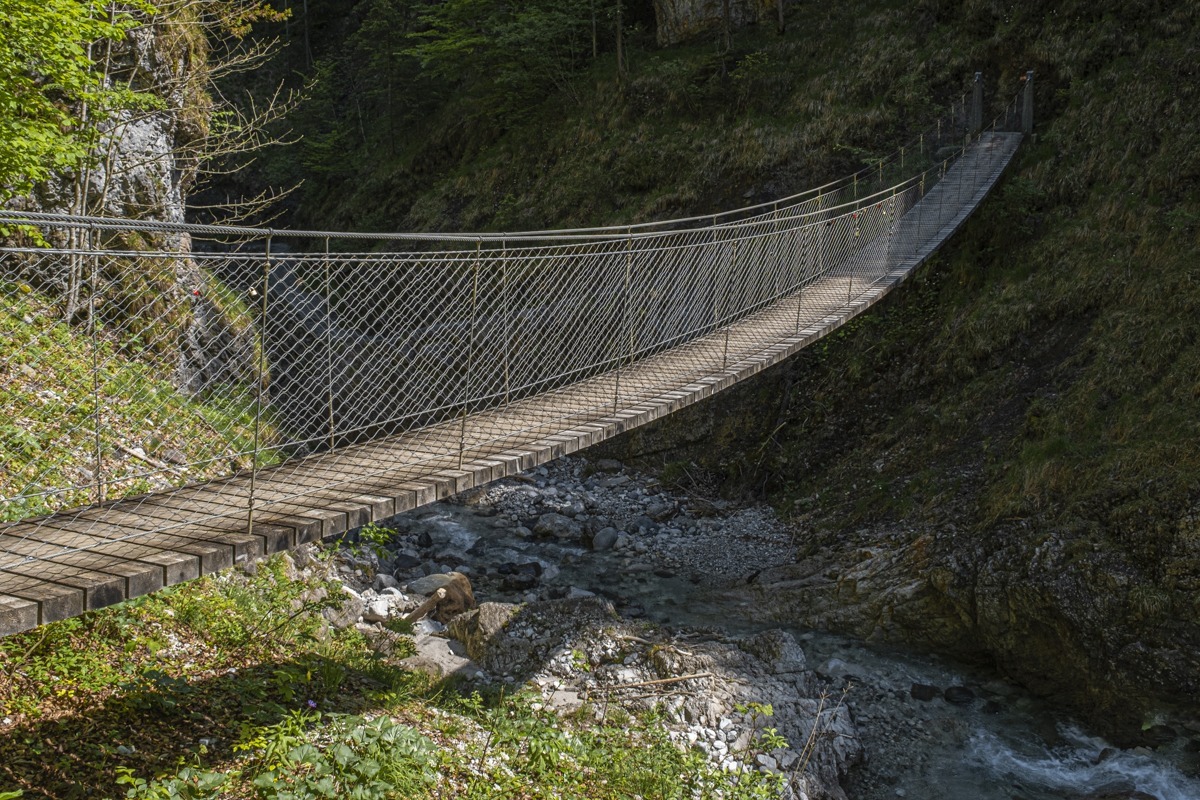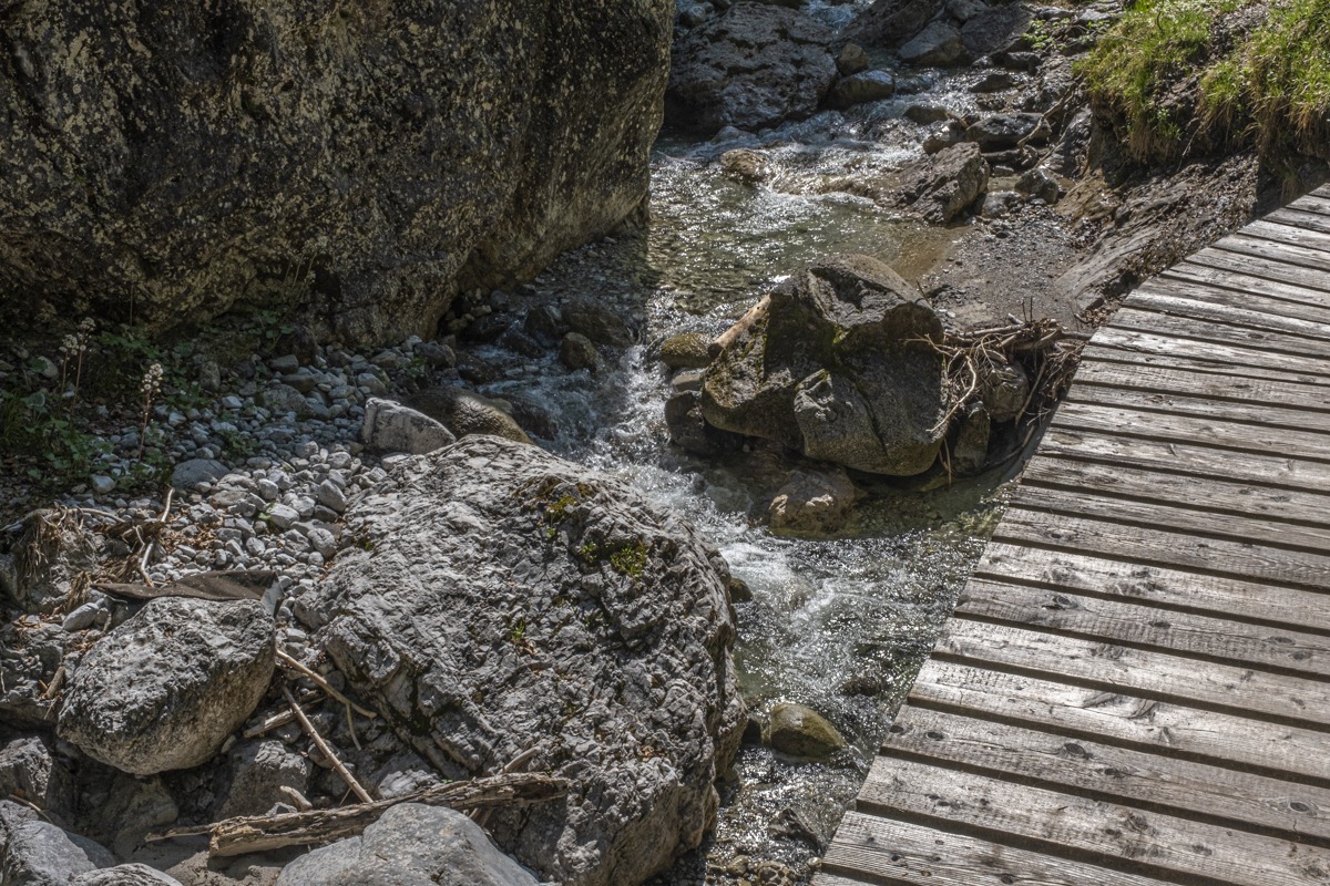 Eine kühle Klamm für einen heißen Tag und anschließend die vorgeschlagene Almenrunde. So ist der Plan. Von dem ausgewiesenen Parkplatz bei Erpfendorf führt ein touristischer Weg (links und rechts ein Zaun) zum Beginn der Klamm, die eher eine breite Schlucht ist. Highlights sind die beiden Hängebrücken und die Bretterwege. Das Ganze mündet in eine sehr breite Forststraße. Nach ca. 1km zeigt rechts der Jägersteig ab. Oberhalb der Angerlalm ist ein kleiner grüner Gupf mit Kreuz. Ich entscheide mich gegen die bewirtschaftete Alm und werde dafür oben mit einer Super-Aussicht belohnt – Kaiser, Unterberghorn, Fellhorn, Steinplatte, Loferer Steinberge. Abgestiegen wird zu einem Teich und weiter zur Huberalm. Geschlossen, so war nicht der Plan. Links unterhalb beginnt dankenswerterweise – ich hatte mit einem Straßenabstieg gerechnet – ein Steig, der bei den Häusern von Erpfendorf endet.