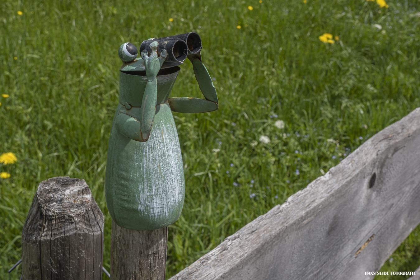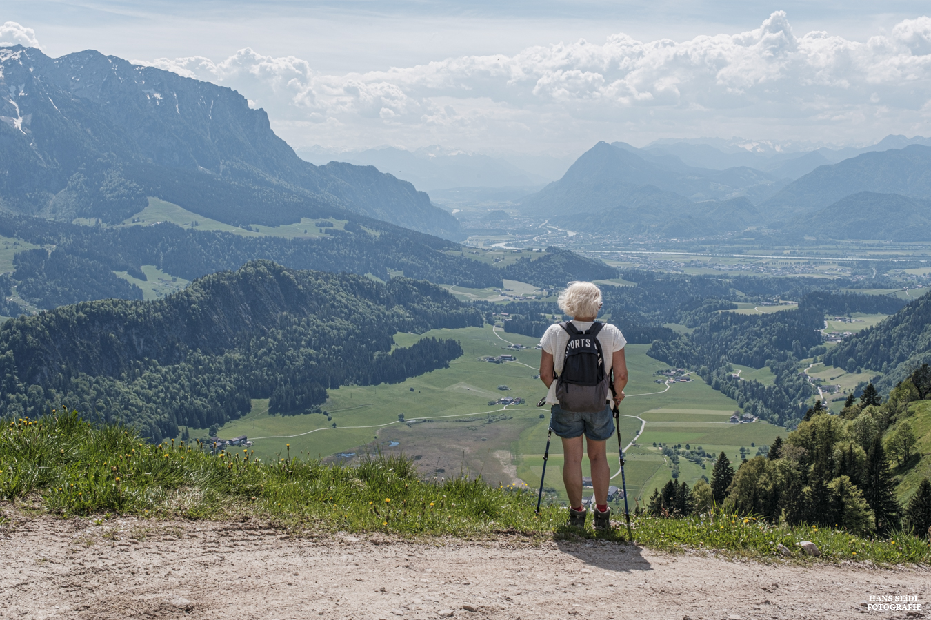 Am Bahnhof von Bayerischzell geht’s los. Hinauf zum Wasserfall und kurz an der Tatzelwurmstraße entlang und hinüber zur Peterbauernalm. Dann öffnen sich die weiten Wiesen von Hochkreuth, sattes Grün mit vielen gelben Punkten. Über uns donnert es. Wir gehen am Siglhof vorbei und auf der Zufahrtsstraße, bis nach links ein Steig abzweigt, zunächst noch in derselben Richtung, bald folgt eine 180° Kehre. Der Rückweg führt über den Aussichtspunkt Nogg hoch über der Leitzach. Mit Gudrun.