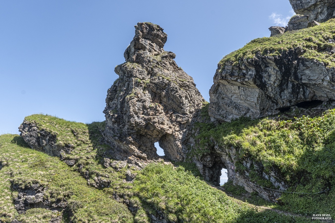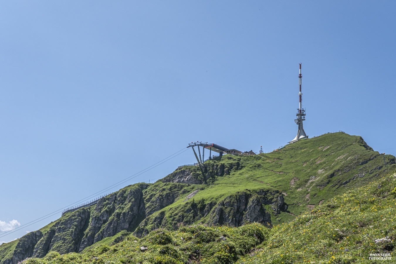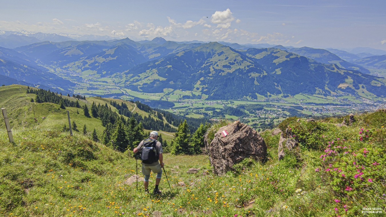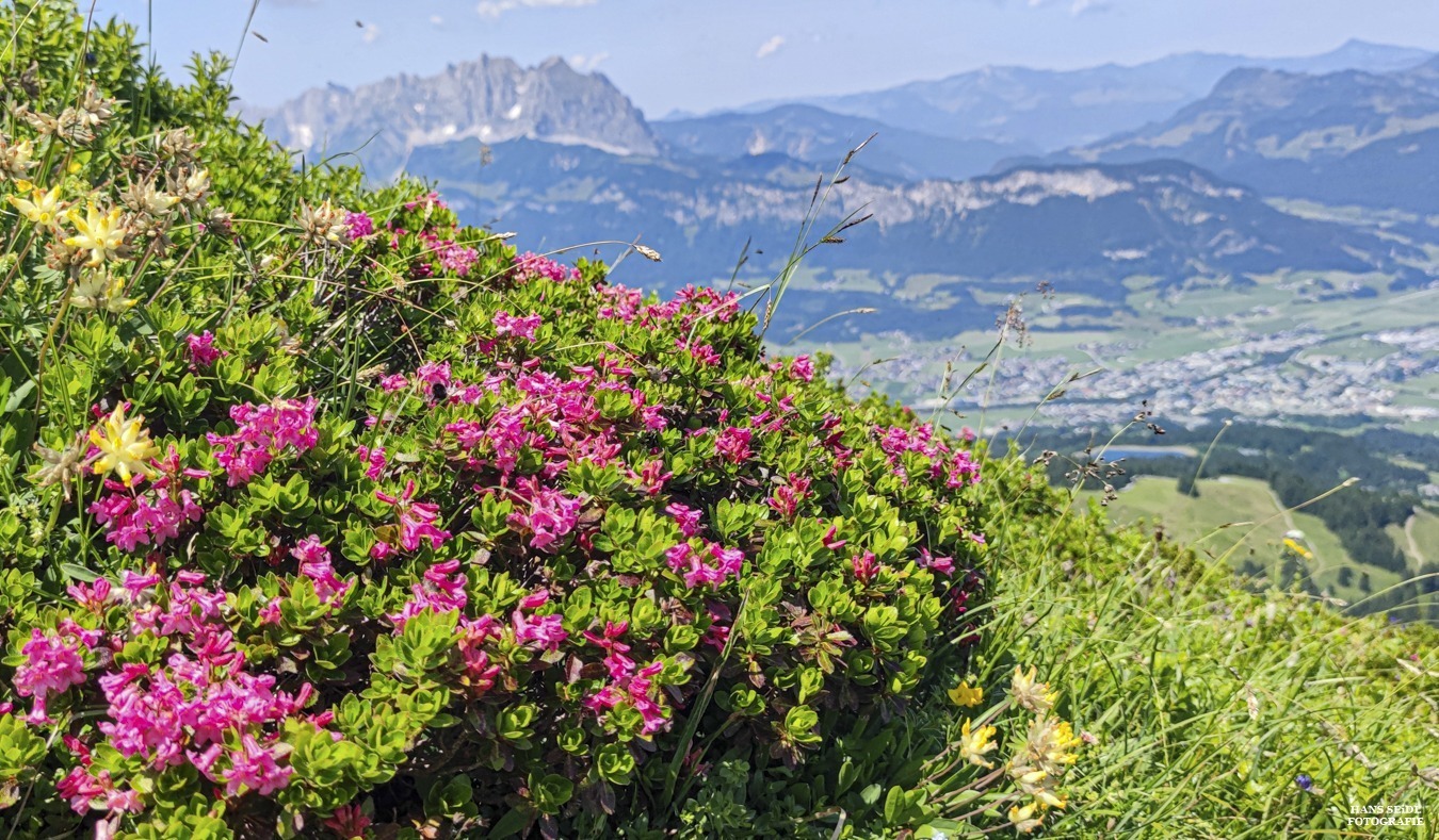 Das Kitzbüheler Horn – oft gesehen – aber nie bezwungen – das muss sich ändern. Die Harschbichl-Seilbahn hilft dabei über die ersten 900Hm hinweg. Wir steigen auf der noch relativ kühlen Nordseite nach oben in abwechslungsreichem Gras/Felsgelände, sehen links den Klettersteig und sind bald in der touristischen Welt. Seine herausragende Lage prädestiniert das Kitzbüheler Horn – genauer den Gipfel – natürlich für jede Art von Sendemasten. Der Gipfel beheimatet auch Bergstationen von Sommer- und Winterseilbahnen. Es ist einiges geboten, was der 360° Aussicht keinen Abbruch tut. Die Hoferschneid und der Jägersteig leiten uns sicher hinunter zur Bergstation der Harschbichl-Bahn. Mit Gudrun.