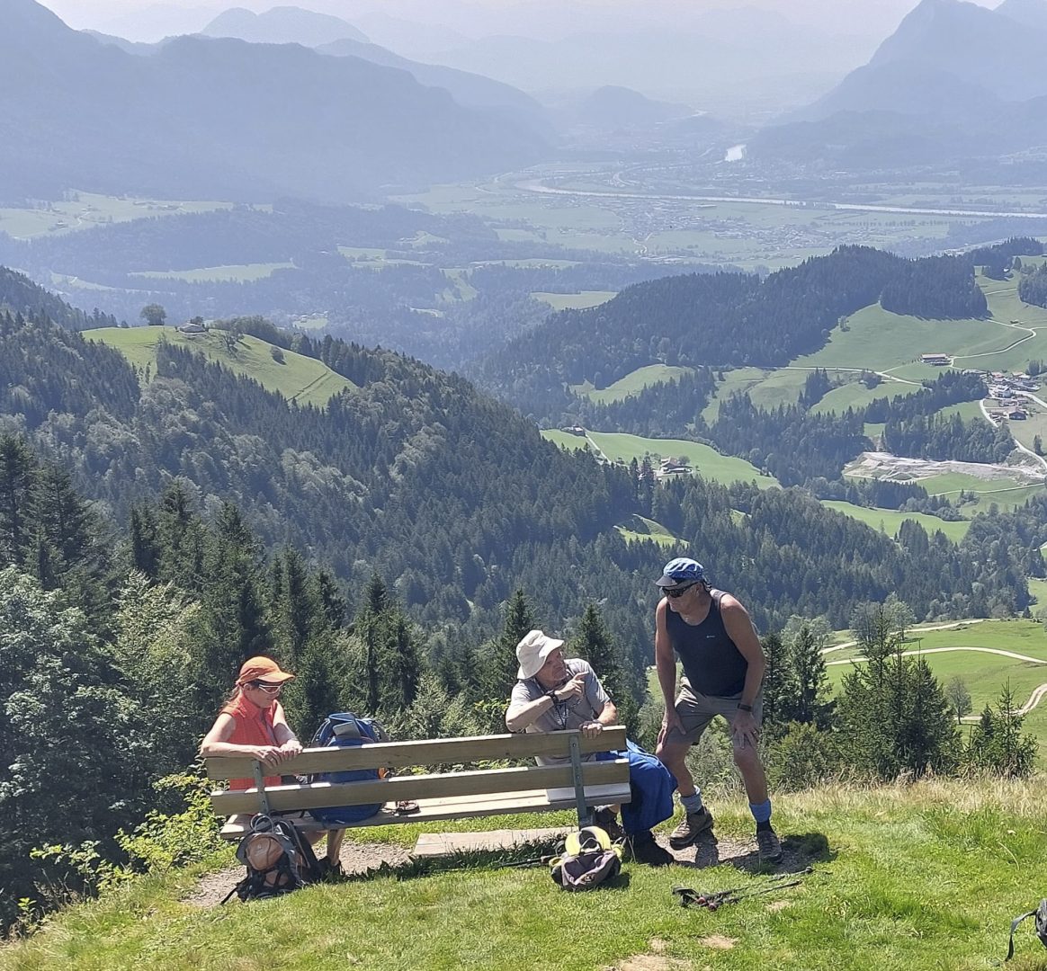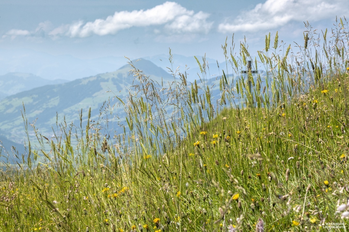 Der beschauliche Bichlalm-Sessellift südlich von Kitzbühel überwindet 700Hm. Wir gehen nach oben, an der Kneippanlage vorbei, und weiter und dann zuerst nach links kurz auf den Hochetz. Wieder zurück und hinauf zum Stuckkogel mit Gipfelkreuz. Der eigentliche Gipfel ist wenige Meter weiter südlich, aber von dort wäre das Kreuz vom Tal aus nicht zu sehen. Es gibt eine angenehme längere Pause im hohen Gras. Für den Abstieg überschreiten den Gipfel und kommen zu einem neu errichteten Kreuz. Weglos hinunter nach Westen über die Wiese zu einer Bank – was aber nur eine Abkürzung ist. Auf Steig und Weg queren wir nun zur noblen Bichlalm. Eine stets aussichtsreiche Tour. Meditativ schwebt der Sessellift ins Tal. Mit Gudrun.