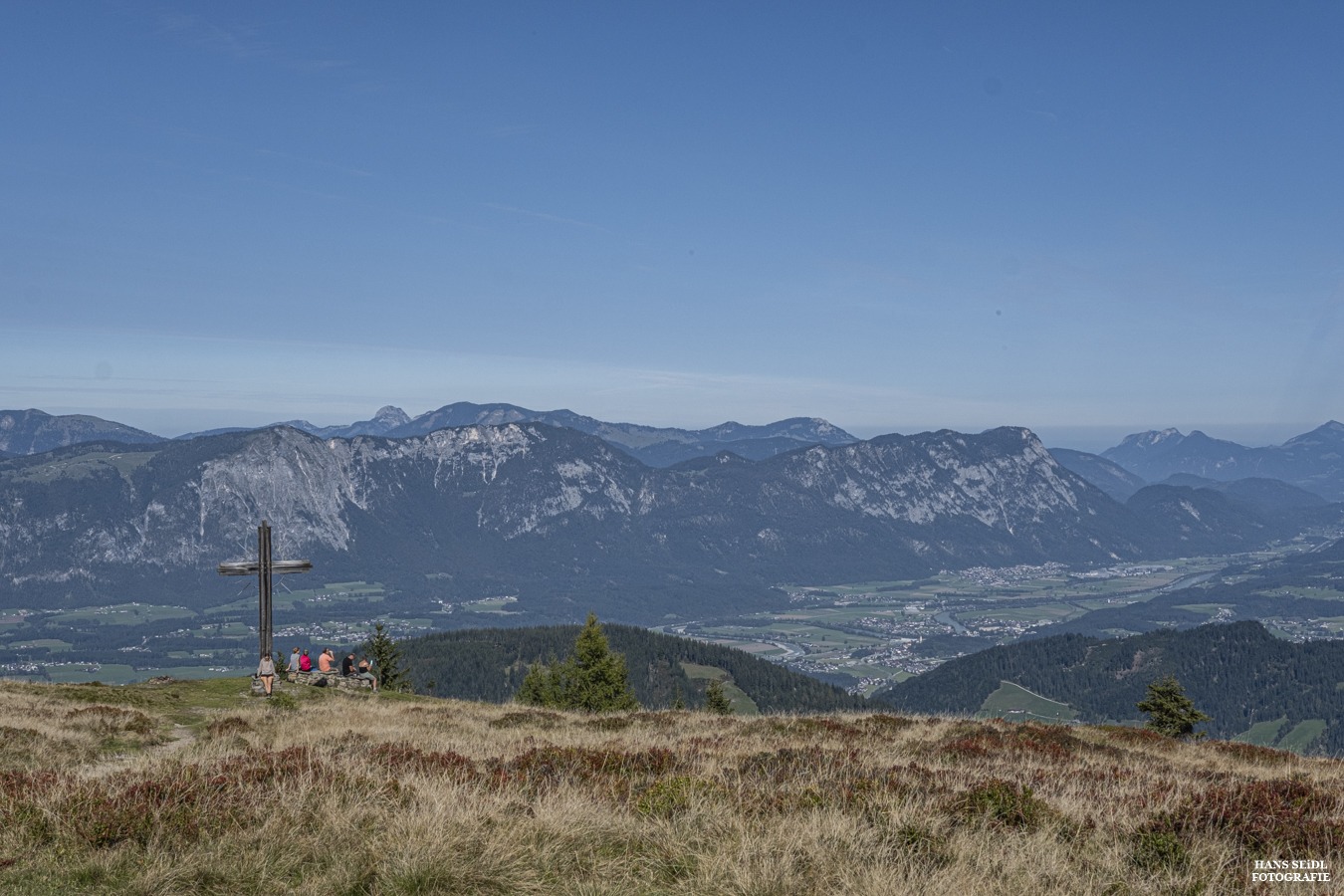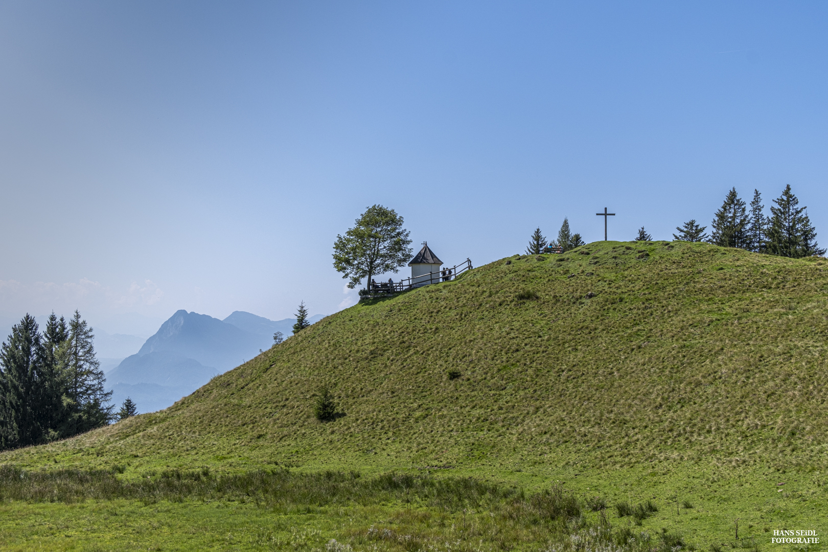 Niederau in der Wildschönau. Die Markbachjoch-Bahn bringt uns in eine hinsichtlich der noch zu bewältigenden Höhenmeter seniorengerechte Höhe. Von der Bergstation gehen wir zur Halsgatterl-Kapelle mit seiner gruselig-grausamen Sage von der Entstehung der Wildschönau. Nach einem tiefen Durchschnaufen wird der Rosskopf-Gipfel angegangen. Nette Aussicht. Und es ist warm. Abstieg nach Süden zur Horler Stiege, und dann in einem 180° Schwenk über die ungemütliche sterile Holzalm zurück zur Bergstation. Mit Gudrun.