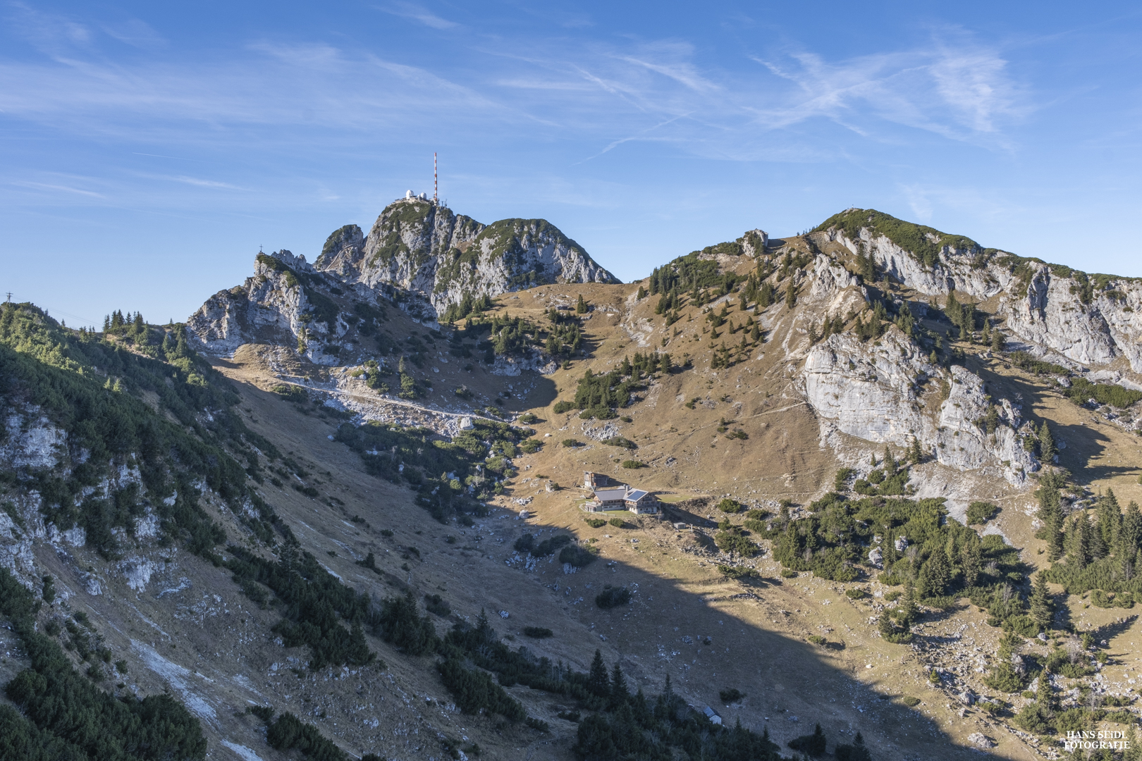 Wanderparkplaz Spatenau. Wir gehen an der Doaglalm rechts vorbei weiter Richtung Karkopf, folgen dem fast eben verlaufenen Ewaldweg. Bei einer (Jagd?)Hütte geht es steil hinauf, nicht markiert, seltener begangen, in die Einsattelung zwischen Feichteck und Karkopf. Über den felsigen Grat auf den Karkopf und hinüber zur Hochries mit Kreuz und Hütte. Jürgen trinkt einen Aperol Spritz. Wir bevorzugen die knieschonende Abfahrt zur Mittelstation. Mit Jürgen.